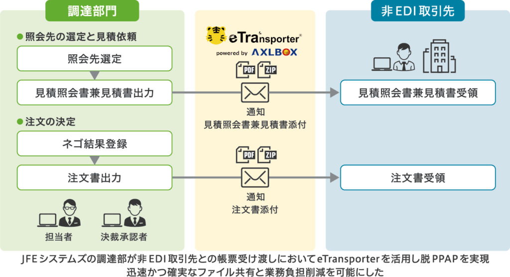 EDI未対応の取引先に対しても、安全で効率的なファイル送受信を実現する手段を模索していた同社が選んだのは、AXLBIT株式会社が提供するファイル転送システム「eTransporter powered by AXLBOX」。選定のポイントとなったのは、①JFEグループのセキュリティポリシーに準拠した設計で容易に設定が行えること、②既存の調達システムに大きな改修を加えずAPI連携が可能であることの2点。AXLBITのサポートによりスムーズな導入検討と試験運用を経て、2024年11月に本格稼働を開始した。従来は暗号化ZIPファイルで帳票を送付していたが、eTransporter powered by AXLBOX導入後はAPI連携により調達システム上の送信操作のみで安全に帳票が取引先へ送信可能に。これにより、メール削除や受信拒否といったトラブルが解消され、再発行や押印作業などの手間が大幅に削減された。